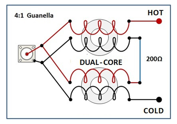 此类型巴伦有时也称电流巴伦,其可保证两个输出端的输出电流相等,但输出电压不一定相等。同轴电缆内部的电流大小相等且相位相反,因此其所产生的磁场强度相等且方向相反,而且在大部分情况下可相互抵消。当将变压器巴伦与传输线变压器巴伦组合时,可实现极宽的工作带宽。人们常将Guanella传输线变压器和巴伦组合用作阻抗匹配变压器。